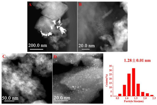 HAADF-STEM (high-angle annular dark-field scanning transmission electron microscopy) images of the catalysts: (A,B) Ru/H-beta-IM; (C,D) Ru/H-beta-IE-250 and particle distribution. “IM” stands for impregnation method, while “IE” stands for ion exchange. Reproduced with permission from [114], Elsevier, 2019.