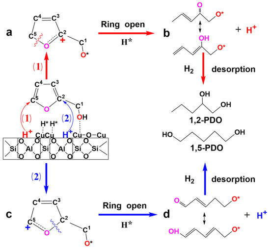 Dai et al. studied the transformation of biomass-derived FOL to pentanediols using several bifunctional Cu/MFI catalysts [173]. One of them, containing a certain combination of Cu0 and Cu+ species as well as Brønsted acid sites, demonstrated excellent catalytic properties. Density functional theory (DFT) calculations showed that successful ring-opening and hydrogenation should be assigned to the synergy between the Cu species and Brønsted acid sites; the latter impact the ring-opening in FOL, while the adsorption of the FOL methyl group on the Cu+ species promotes hydrogenation (Figure 7).