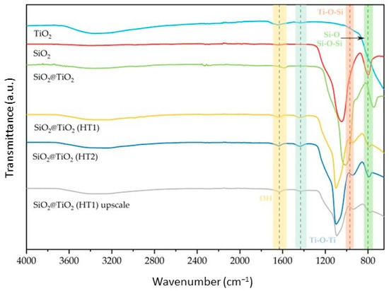 Regarding the SiO2@TiO2 (HT1) upscaled sample, when compared with the one synthesized at the lab scale, it is possible to verify the same peaks relative to the bands identified above, showing that the NPs developed in the upscaled process present the expected composition when analyzed by this technique.