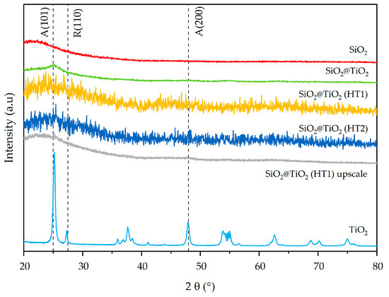 The mixed anatase–rutile phases are also evident in the 2θ = 60–80° range of hydrothermally treated SiO2@TiO2 core-shell materials (HT1 and HT2). The XRD pattern of the SiO2@TiO2 HT1 upscaled sample indicates diffraction peaks at 2θ ≈ 25° and 2θ ≈ 47.5° corresponding to the anatase phase, just like the correspondent lab-scale HT1 sample, suggesting that the upscaling process was successful.