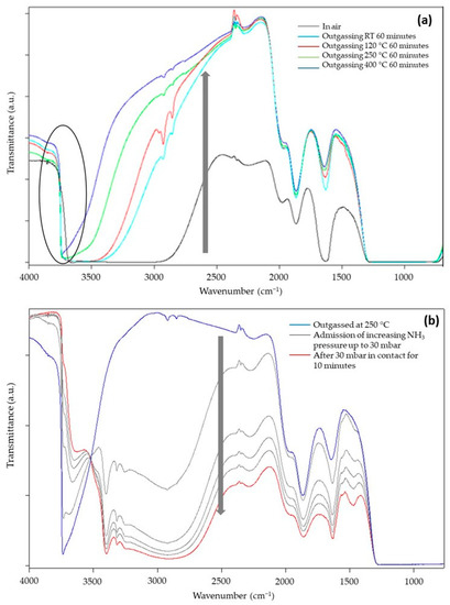 The presence of NH3 causes an important decrease in the optical transparency (arrow in Figure 7b) of the sample with the formation of signals related to NH4+ species (1450 cm−1) and NH3 interacting with Lewis acidic sites of material (1630 cm−1), both confirmed by the presence of the signal at 3300 cm−1. Moreover, the isosbestic point at 3520 cm−1 indicates that free OH groups progressively interact with increasing doses of NH3 molecules forming H-bonds. All these interactions depend on the NH3 pressure; therefore, a decrease in the amount of NH3 in the cell causes a partial recovery of the original profile of the spectrum, indicating a partially irreversible interaction of the molecule with the surface of the sample.