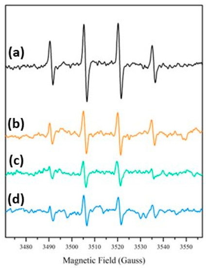 DMPO-OH EPR spectra after irradiation under simulated solar light: (a) SiO2@TiO2; (b) SiO2@TiO2 (HT1); (c) SiO2@TiO2 (HT2); and (d) SiO2@TiO2 (HT1) upscaled.