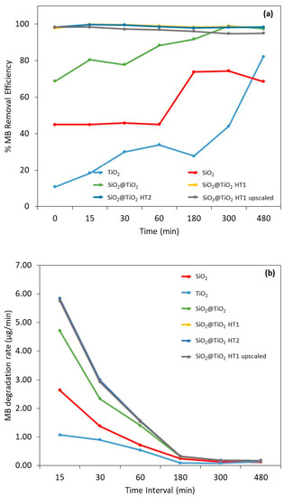 Results of (a) methylene blue removal efficiency and (b) degradation rate (µg/min) after 0, 15, 30, 60, 180, 300, and 480 min after UV radiation exposure. The vertical broken line represents the beginning of irradiation. The yellow experimental points of SiO2@TiO2 (HT1) are hidden by the experimental points of SiO2@TiO2 (HT2).