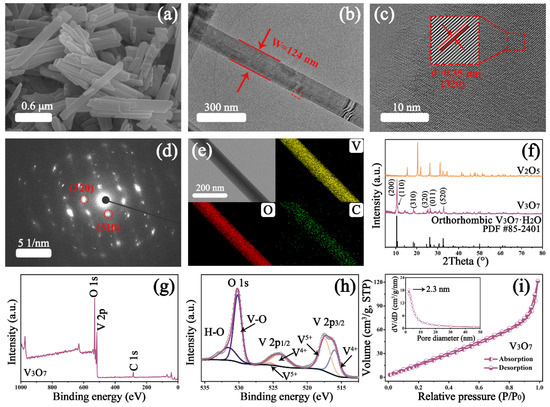 (a) SEM image, (b) TEM image, (c) HR-TEM image, (d) SAED pattern, and (e) elemental mapping of V3O7 nanorods; (f) XRD patterns of V2O5, V3O7, and the standard card for comparison; (g) XPS survey spectrum of V3O7 and (h) high-resolution spectrum of V 2p and O 1s; (i) the N2 adsorption/desorption isotherm of V3O7 sample; inset shows the corresponding distribution of pore size.
