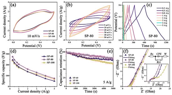 (a) CV curves at a scan rate of 10 mV/s of SP-60, SP-80, and SP-100 electrodes; (b) CV curves at different scan rates and (c) GCD curves at different current densities of SP-80 electrode; (d) specific capacitance at various current densities; (e) cycling stability at a current density of 5 A/g and (f) the Nyquist plots of SP-60, SP-80, and SP-100 electrodes; insets show the equivalent circuit and the Nyquist plots at the high-frequency region, respectively.