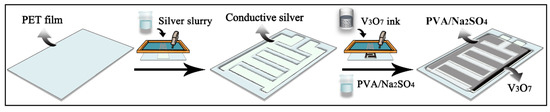 Vanadium pentaoxide (V2O5), ethanol (EtOH), sodium sulfate (Na2SO4), N-methyl-2-pyrrolidone (NMP), and polyvinyl alcohol (PVA) were purchased from Shanghai Maclin Biochemical Technology Co., Ltd. (Shanghai, China). Ag slurry and polyethene terephthalate (PET, 0.2 mm in thickness) film were traded commercially. Nickel foam (1.0 mm in thickness) and polyvinylidene fluoride (PVDF) emulsion were bought from Saibo Electrochemical Materials Co., Ltd. (Beijing, China). All reagents were of analytical purity without treating further. The vanadium heptoxide monohydrate (V3O7·H2O) template was prepared referring to the previous study [25]. Deionized water (H2O) was used during the whole experiment.