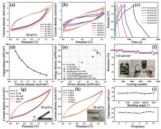 (a) CV curves of the V3O7 SSC at 30 mV/s under different potential windows, (b) CV curves at different scan rates, (c) GCD curves at different current densities, (d) the corresponding specific capacitance, (e) the Ragone plots, (f) the cycling stability at 3.0 mA/cm2, CV curves acquired at 30 mV/s at different (g) bending angle and (h) bending frequency, and (i) the corresponding areal-specific capacitance.
