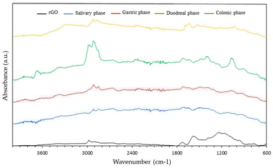 Regarding digested rGO samples, it should be noted that the peaks described above are maintained in all cases, although at a lower intensity. However, an increase in the intensity of the C-H absorption band is observed. This fact corroborates what was described by Bitounis et al. [], who detailed that the agglomeration of carbonaceous material could favor associations between different regions of the g.i. system due to acidic conditions, bile salts, and other digestive enzymes, although with a lower intensity.