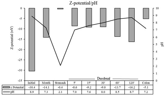 Z potential measurement of rGO and pH values in initial, saliva, gastric, duodenal, and colonic phases.