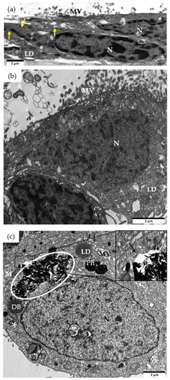TEM images of cellular internalization of rGO in Caco-2 cells. Unexposed control cells (a), and cells exposed for 24 h to 100 µg/mL rGO from duodenal phase (b), or colonic phase (c). DB, dense bodies; Ph, phagosome; LD, lipid droplets; M, mitochondria; MV, microvilli; N, nucleus; *, multivesicular bodies; black arrow, endocytic membrane; yellow arrow, endoplasmic reticulum, and graphene materials indicated by the circle. Scale bar: 2 μm.