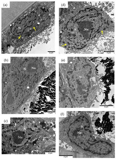 TEM images of cellular internalization of rGO in HepG cells for 24 h (a–c) and 48 h (d–f). Unexposed control cells (a,d), and cells exposed to 100 µg/mL undigested rGO (b,e), or digested rGO (c,f). N, nucleus; Nu, nucleolus; *, lipid droplets; yellow arrow, endoplasmic reticulum; black arrow, extracellular vesicles, and white star, mitochondria. Scale bar: 2 μm.