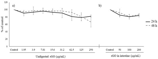 Viability of HepG2 cells exposed to 0–250 µg/mL undigested rGO (a), and 50, 100, and 200 µg/mL digested rGO (duodenal phase) (b) for 24 h and 48 h. All values are expressed as mean ± SD.