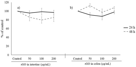 For the cytotoxicity tests, HepG2 cells were exposed to different concentrations of undigested rGO (0–250 µg/mL) and digested rGO after the duodenal phase (50, 100, and 200 µg/mL). Caco-2 cells were exposed to undigested (200 µg/mL) and digested rGO after duodenal and colonic phases (50, 100, and 200 µg/mL) for 24 and 48 h. The digestas taken were centrifuged and resuspended in the same volume of the cell culture medium. MTS (3-(4,5-dimethylthiazol-2-yl)5-(3-carbox-ymethoxyphenyl)-2-(4-sulfophenyl)2 H-tetrazolium salt) reduction was measured as basal cytotoxicity endpoint following the protocol described by Cebadero et al. []. In order to show the correct performance of the cytotoxicity tests, additional experiments including a positive control (Triton X-100 0.3%) were carried out.