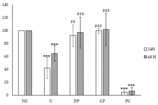Viability of Caco-2 cells after 24 and 48 h exposure to negative control (NC), duodenal phase 200 µg/mL (DP), colonic phase 200 µg/mL (CP), undigested rGO 200 µg/mL (U), and positive control (Triton X-100 0.3%, PC). Values expressed as mean ± sd. ***, p < 0.001 significantly different from the negative control group; ##, p < 0.01, ###, p < 0.001 significantly different from the undigested sample.