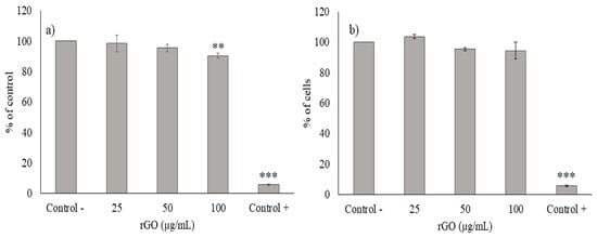 Cytotoxicity of undigested rGO (a), and digested rGO (duodenal phase) (b) at different concentrations (0–100 µg/mL) after 24 h in the EpiIntestinalTM model. All values are expressed as mean ± SD. Triton (0.3%) was used as positive control. **, p < 0.01 and ***, p < 0.001 significantly different from the control group.