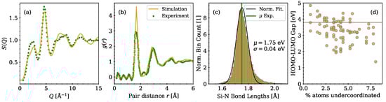 Our model structures correctly reproduce the key structural properties of silicon nitride thin films. The structure factor S and radial distribution function  of a model structure were compared to sample characterizations from scattering experiments [,] in Figure 1a,b. The average experimental Si-N bond length of 1.75 Å (indicated by the green vertical line in Figure 1c) coincides with the peak of the Si-N bond length distribution over all generated structures. The tail of the distribution at higher values can be attributed to slightly strained bonds in the amorphous network and is in agreement with previous theoretical studies [,]. N-N bonds and Si-Si bonds were completely absent in all of our quenched structures due to the high energies associated with these structures in the training data set of the ML-IP. The mass density of the structures is 2.93 g cm−3, which is in the range of experimental values varying from 2.3 to 3.0 g cm−3 [].