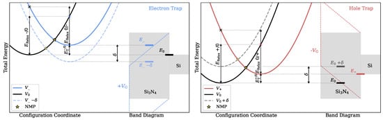 Numerous studies have shown that charge trapping processes can be accurately described by a nonradiative multi-phonon model [,] with the most important parameters of the model, namely the relaxation energies  and trap level , schematically depicted in Figure 2.