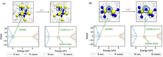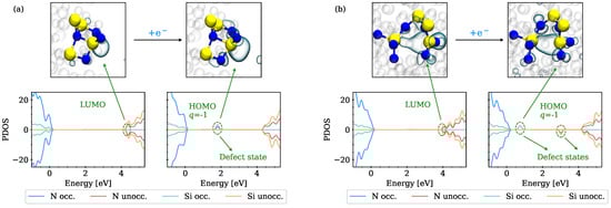 Positive and negative values of the PDOS correspond to the majority and minority spin channels, respectively. We find that electronic states near the valence band maximum (VBM) are introduced either by overcoordinated Si or undercoordinated N, which is in agreement with previous theoretical and experimental studies [,,]. In the first case, the HOMO is semi-localized and hybridized around the five adjacent N atoms of the overcoordinated Si, as shown in Figure 3a (top), with the isosurface of the orbital drawn at a value of 0.05 e/Å. When a hole is introduced to the system, the structure relaxes to a new minimum energy configuration, thereby shifting the state at the VBM, now unoccupied, towards the middle of the band gap. Similarly, in the second structure, where the HOMO localizes at an undercoordinated N, a hole can be trapped at the two-fold coordinated N, thereby shifting the now unoccupied state towards the middle of the band gap as shown in Figure 3b.