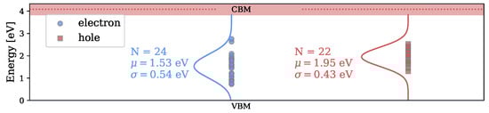 The energies of the Kohn–Sham states introduced in the band gap by adding a hole or an electron to the system are shown in Figure 5. The energies are given with respect to the VBM of each structure. A normal distribution was fitted to the energies with the fitting parameters shown in the plot. The CBM is given as a band with the energetic distance to the VBM according to the distribution of HOMO–LUMO gaps of the analyzed structures. The energy distribution of the occupied states after electron capture is slightly broader and lower in energy compared to the distribution of unoccupied states after trapping a hole.