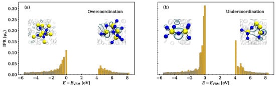 For a fully delocalized state, the IPR has a comparably small value, while it increases for decreasing spatial extensions of the state. The IPR was calculated for two model structures: one where the states at the band edges correspond to overcoordinated atoms as shown in Figure 6a and one where the band edges correspond to undercoordinated atoms as shown in Figure 6b.
