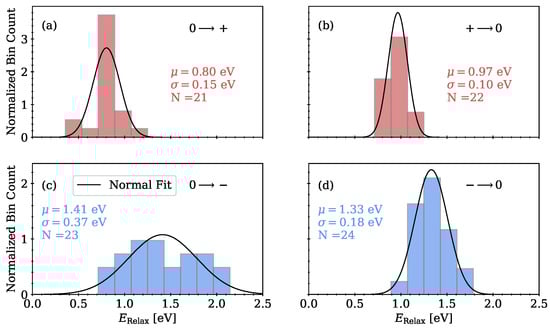 Relaxation energies according to the notation in Figure 2 were calculated by performing single point calculations on relaxed configurations in different charge states and subsequently calculating the energy difference to the energy of the relaxed system in the same charge state. The relaxation energies for hole capture, hole emission, electron capture and electron emission are shown in Figure 8a–d with the parameters of fitted normal distributions given in the plots. The distributions of the relaxation energies show that for charge transfer processes involving electron transfer, the energies gained by structural relaxations of the systems are roughly 0.5 eV higher than for hole transfer. Furthermore, the energy distributions involving electron transfer are again broader compared to the energy distributions for hole transfer.