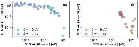 where  is the total energy of the defect system,  is the total energy of a reference system such as a pristine bulk and  corresponds to the energy needed to add or remove n atoms of type i with the chemical potential .  is a correction term needed for DFT calculations for charged systems with periodic boundary conditions to remove any artificial interactions of the charged defect with its periodic image. This term was calculated as  eV for our systems employing the sxdefectalign tool, which implements the Freysoldt–Neugebauer–Van de Walle correction scheme [].  corresponds to the energy of the transferred charge carrier, given with respect to the highest occupied Kohn–Sham state . When comparing the formation energies of the charged and uncharged systems, the energy of the reference system  cancels out and  as no structural defect is created. The CTL corresponds to the energy of the transferred charge carrier where the formation energies of the charged and uncharged structure are equal . It can be related to the trap level by . To date, only the energetic positions of the minimum configurations were considered. To study the charge trapping dynamics however, additional information about the PECs is required. This is provided by the relaxation energies , which are a measure for the curvature of the PECs near the minimum. Furthermore, for optical transitions,  corresponds to the energy difference between a given initial defect state and its relaxed configuration after an immediate (un)charging event. With these parameters, the PECs in two charge states can be modeled relative to each other and the energy barriers for charge capture and emission can be extracted from the crossing point.