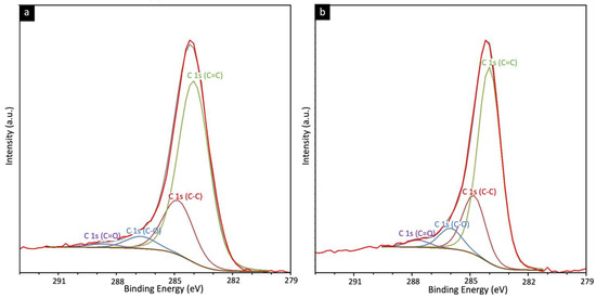 Raman spectroscopy was used to estimate the degree of graphitization. The Raman spectrum of graphite is defined by the presence of two sharp peaks. The peak around 1580–1600 cm−1 known as the G-band is associated with ordered graphitized carbon (sp2), while the peak around 1350 cm−1 known as the D-band is related to disordered amorphous carbonaceous species (sp3) [49,50].