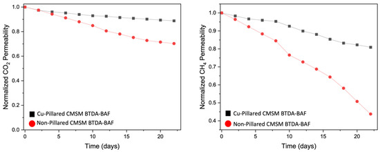 Plot of normalized CO2 and CH4 permeability versus time at 2 atm and 35 °C for non-pillared and Cu-pillared CMSMs from BTDA-BAF.