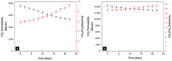 CO2 permeability and CO2/CH4 selectivity versus time for (a) BTDA-BAF CMSMs and (b) 40% w/w MOP-18/ BTDA-BAF CMSMs carbonized at 550-0 h.