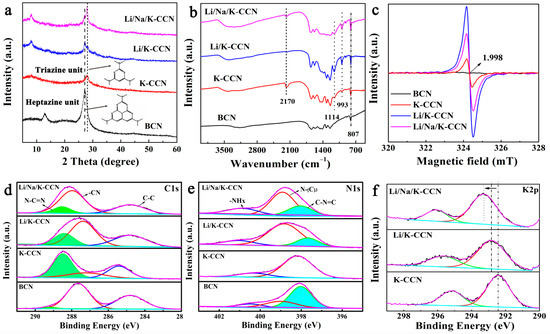 (a) X-ray diffraction (XRD) patterns, (b) Fourier transform infrared (FT-IR) spectra, (c) electron paramagnetic resonance (EPR) spectra, and X-ray photoelectron spectroscopy (XPS) of (d) C 1s, (e) N 1s, (f) K 2p of BCN, K-CCN, Li/K-CCN, and Li/Na/K-CCN.