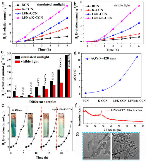 Time courses of photocatalytic hydrogen evolution under (a) simulated sunlight and (b) visible light of BCN, K-CCN, Li/K-CCN, and Li/Na/K-CCN, (c) the comparison chart of hydrogen evolution rate for different samples, (d) the apparent quantum yield (AQY) of BCN, K-CCN, Li/K-CCN, and Li/Na/K-CCN, (e) four cycling HER tests of Li/Na/K-CCN under visible-light irradiation, (f) XRD and (g) TEM images after four cycling HER tests of Li/Na/K-CCN.