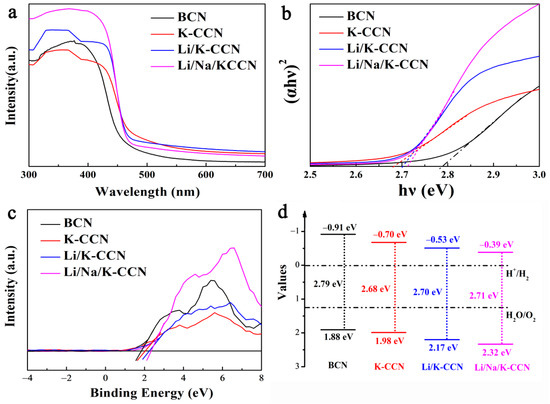 (a) UV-visible absorption spectra, (b) corresponding band gap energies, (c) VB-XPS plots, and (d) simplified band structures of BCN, K-CCN, Li/K-CCN, and Li/Na/K-CCN.
