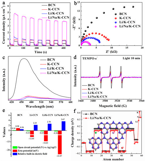 The photo-current curves of BCN, K-CCN, Li/K-CCN, and Li/Na/K-CCN are revealed in Figure 5a. Among the four samples, Li/Na/K-CCN exhibits the optimal photocurrent density, owing to the rapid separation of photo-generated carriers and the increased charge migration in the type-II Li/Na/K-CCN heterojunction. Furthermore, as revealed in Figure 5b, the semi-circular radius of the Nyquist plots of four samples indicated the order of BCN > K-CCN > Li/K-CCN > Li/Na/K-CCN. It is demonstrated that the high crystallinity of g-C3N4 could reduce the impedance of catalysts; in particular, the formation of heterojunctions would further enhance the conductivity of samples through built-in electric fields. As seen in Figure 5c, BCN exhibits a wide and strong PL emission peak centered at 457 nm, ascribed to the rapid recombination of photo-induced charge carriers [43]. Contrarily, the three CCN samples present a similar low emission intensity, demonstrating the discernible improved separation of the radiative carriers. TEMPO spin-labeled ESR was investigated to further demonstrate the efficient photo-generated charge separation of Li/Na/K-CCN. As seen in Figure 5d, the weakened ESR signal of Li/Na/K-CCN is attributed to the electrons captured by TEMPO, which indicates that more carriers are induced in the Li/Na/K-CCN sample [42]. Meanwhile, it can be clearly seen in Figure S4 that, with the increase in the light radiation time, a wider ESR spectral peak is formed, which indicates that the production of electrons depends on the irradiation of light. Based on the calculation method of BIEF reported by Zhang et al. [45], the intensity of BIEF of the four samples was calculated from the open circuit potential (vs. NHE) and zeta potential, as illustrated in Figure 5e. Briefly, the relative BIEF values for BCN, K-CCN, Li/K-CCN, and Li/Na/K-CCN are 0.56, 2.25, 2.70, and 3.67, respectively. Moreover, the existence of BIEF was simulated by the DFT calculations. The atomic charge densities of BCN and Li/Na/K-CCN are exhibited in Figure 5f, and the corresponding atomic numbers in Li/Na/K-CCN are presented in the background of Figure 5f, which implies the charge density in Li/Na/K-CCN undergoes a polarized distribution compared with that of BCN. The results in Figure 5 demonstrate that Li/Na/K-CCN has an enhanced BIEF via the formation of type-II heterojunctions, which greatly boosts the photocatalytic performance by promoting photo-induced charge generation, separation, and migration.