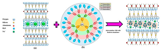 General representation of the impregnation of sodium bentonite NBt (a) with Boltron-type dendritic nanomolecules of second, third and fourth generations (b).