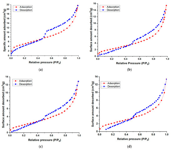 The nitrogen adsorption–desorption isotherms are similar for all fourth adsorbent materials. According to the IUPAC classification, they are of type IV, being specific to mesoporous adsorbents. Hysteresis occurs due to the fact that the adsorbed molecules do not desorb as easily as they were adsorbed. The hysteresis loop is of the H3 type, indicating the presence of aggregates of flat particles or adsorbents containing slit-shaped pores.