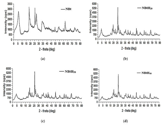 These modifications to the NBt samples using organic fragments (Figure 4) led to a decrease in the d001 basal distance, leading lower 2-theta values [44,47]. However, it can be observed that the sharp reflection of 001 XRD decreases; a possible explanation for this is the loss of the micro-porosity level. Impregnation with Boltron organic solutions produced more disordered interlamellar arrangements in the clays [45,46,47].
