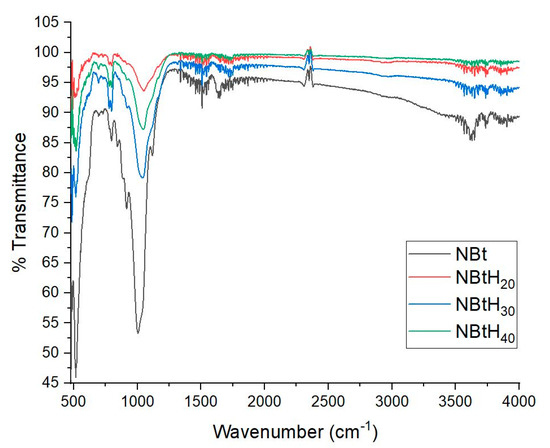 The textural properties determined via BET N2 adsorption analysis for the raw material and for the three synthetized nanomaterials (NBtH20, NBtH30, and NBtH40) are presented in Figure 3.