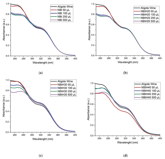For the other spectra at the same wavelengths (Figure 7b,c), there are increases in the absorbance when using 500 µL of NBtH40 (Figure 7d) at 315–325 nm; a possible explanation for this is the higher level of oxidized polyphenolic compounds. The same is observed for NBtH30, as a result of the increase in oxidized polyphenols, followed by NBtH20.