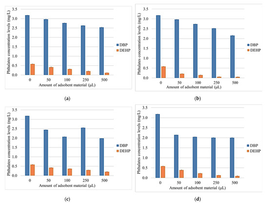 After treatment with the adsorbent materials modified with Boltron dendrimers of the fourth generation, an 85% reduction in DEHP can be observed (Figure 8d), and in the case of the NBtH30 nanomaterial, a 50% decrease in DBP can be seen (Figure 8c).