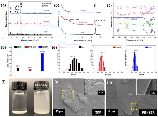- Ding, H.; Wang, Y.; Liang, Y.; Qin, F. Preparation and Characterization of Cetyl Trimethylammonium Intercalated Sericite. Adv. Mater. Sci. Eng. 2014, 2014, 480138. [Google Scholar] [CrossRef]