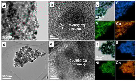 The CoxNiyS nanomaterials with different Ni and Co ratios, characterized by transmission electron microscopy (TEM), are shown in Figure 3. Figure 3a,d show the TEM images of CoNiS and Co2NiS. Figure 3b,e show the HRTEM images of CoNiS and Co2NiS. The results indicate that CoNiS and Co2NiS were well crystalline. The lattice spacing of 0.200 nm corresponds to the (102) crystal plane of the CoNiS catalyst, and the lattice spacing of 0.196 nm corresponds to the (102) crystal plane of the Co2NiS catalyst. Energy-dispersive X-ray spectroscopy (EDS) was carried out as shown in Figure 3c,f. The distributions of the Co, Ni, and S elements almost overlapped, indicating that the sulfide was successfully homogeneously coupled with the cobalt and nickel bimetals. The (102) lattice spacing of the CoxNiyS catalyst gradually decreased with the increase in Co proportion, with NiS (0.205 nm) > CoNiS (0.200 nm) > Co2NiS (0.196 nm) > CoS (0.193 nm), which was consistent with the XRD results (Figure 1b). The crystal plane angle shifted towards the positive direction, corresponding to a gradual decrease in the lattice spacing with the increasing proportion of cobalt.