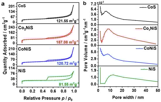 Figure 4a shows the N2 adsorption/desorption curves of the CoxNiyS catalysts, and they all exhibited type IV isotherms. The specific surface areas of the NiS, CoNiS, Co2NiS, and CoS catalysts were 81.55, 120.72, 187.08, and 121.55 m2 g−1, respectively, showing a volcano-type curve as the content of Co increased. The specific surface area of Co2NiS was the largest. This may indicate that when the metal content ratio of Co:Ni reached 2:1, the Co2NiS catalyst provided more active sites. Figure 4b shows the pore size distribution of the CoxNiyS catalyst with a mesoporous structure (2–50 nm).