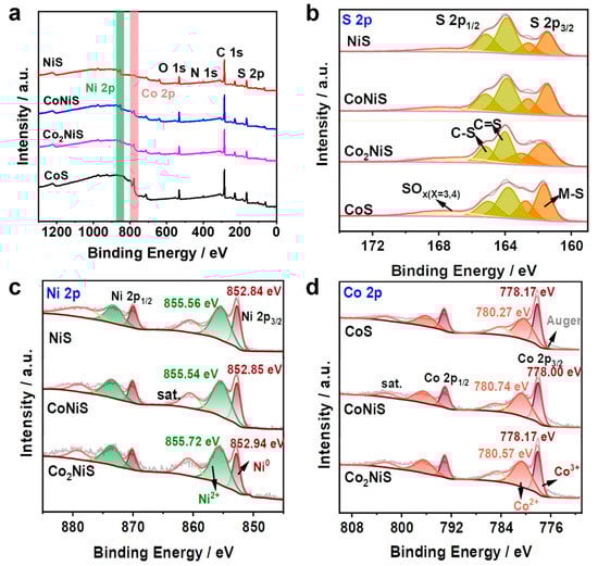 The elemental composition and electronic interactions on the surfaces of the bimetallic sulfides were investigated by X-ray photoelectron spectroscopy (XPS). As shown in Figure 5a, the full spectra showed the presence of several elements of Ni, Co, O, S, N, and C (Figure S2). The oxygen possibly originated from the surface oxidation of nitrogen-doped carbon metal sulfides and nitrogen oxides, with the peaks at 531.43 eV and 533.0 eV corresponding to oxygen species in metal–oxygen bonds and OH- functional groups, respectively (Figure S2b) [42,43]. Figure 5b shows the S 2p spectrum containing S 2p3/2 and S 2p1/2, which can be attributed to the sulfur ion in the metal ion coordination [44,45]. Figure 5c shows the Ni 2p for NiS, CoNiS, and Co2NiS. The Ni 2p3/2 peaks at 852.84 eV and 855.56 eV represent the metallic Ni and Ni2+ species, and the peaks at 860.45 eV and 878.04 eV indicate the satellite peaks of metallic Ni for NiS [46,47]. Figure 5d shows the Co 2p for NiS, CoNiS, and Co2NiS. The Co 2p3/2 peaks at 780.35 eV and 778.15 eV corresponded to Co2+ and Co3+, respectively, and the peaks at 784.72 eV and 802.81 eV were characteristic of the metallic Co. Since the Co 2p region overlapped with some of Co LMM oscillations, the Co LMM oscillation peak likely occurred at around 776 eV [48,49]. For the Co 2p orbitals, as the proportion of Co increased, the binding energy of Co2+ shifted negatively by 0.17 eV and 0.47 eV for Co2NiS and CoS, respectively, while the binding energy of Ni2+ shifted positively by 0.18 eV for Co2NiS [50,51].