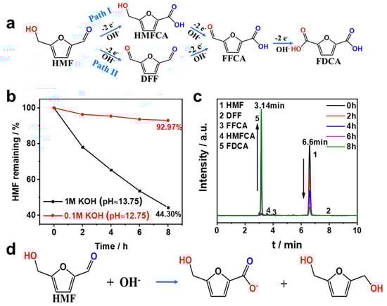 The electrochemical oxidation of HMF usually occurred under alkaline conditions, but we found that HMF was unstable at high pH levels. Figure 6b,c show the time-concentration profiles and HPLC chromatogram profiles of 10 mM HMF in KOH solution. The results showed that less than 50% of HMF remained after 8 h in 1 M KOH solution without any treatment, and the HMF remained around 90% in a 0.1 M KOH solution. This phenomenon was mainly attributed to the fact that the aromatic aldehyde without α-hydrogen atoms of HMF undergoes its redox via the Cannizzaro reaction (Figure 6d) at high concentrations of OH−, and therefore, the electrochemical oxidation test of HMF should be carried out at lower alkaline conditions [12]. Thus, 0.1 M KOH solution was chosen for the electrochemical oxidation of HMF in this experiment [13].