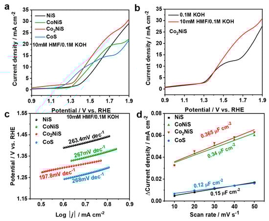 (a) LSV curves of NiS, CoNiS, Co2NiS, and CoS in 0.1 M KOH with 10 mM HMF; (b) LSV curves of Co2NiS in 0.1 M KOH and 10 mM HMF in 0.1 M KOH; (c) Tafel plots of different catalysts in 0.1 M KOH at a scan rate of 10 mV s−1; (d) electrical double-layer capacitance of the catalysts derived from the current density vs. scan rate.