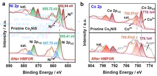 To deeply understand the relationship between the structure and activity of catalysts for HMF oxidation, the statuses of active sites should be identified. The analysis of the chemical state for Co2NiS before and after cyclic electrolysis, investigated by XPS spectra, is shown in Figure 9. Figure 9a,b demonstrates the peaks of Ni 2p and Co 2p of Co2NiS before and after HMFOR. Figure S5 shows the full spectrum and the C 1s, O 1s, and S 2p XPS spectra of the catalyst Co2NiS, respectively. As shown in Figure S5a, the peak signal of O 1s in the full spectrum of Co2NiS became relatively stronger after HMFOR. S 2p disappeared after the reaction, indicating that the catalyst surface changed and the elemental sulfur was dissolved into the electrolyte during electrolysis. As shown in Figure S5b, the peak of C 1s appears around 290 eV after HMFOR due to the element K in the KOH remaining on the catalyst surface. Figure S5c shows the split peaks of O 1s for Co2NiS before and after HMFOR. The peaks at 531.18 eV and 532.58 eV for O 1s before the reaction were associated with the O species in the OH– functional group and chemisorbed water, and a decrease in adsorbed water could be seen after electrolysis [42,43].