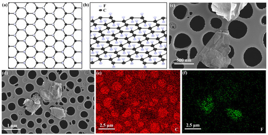 As shown in Figure 2, the structure of F-graphene used in this study was characterized by scanning electron microscopy (SEM). Figure 2a,b shows the most stable chair-like configuration of F-graphene with a fluorine-carbon ratio of 1:1 [47], where fluorine atoms preferentially bond to the carbon atoms on the opposite side of the graphene layer. The SEM images (Figure 2c) reveal that F-graphene has a lateral size of approximately 2 μm and a very thin thickness, and it exhibits curling, wrinkling and folding features. The edge part of F-graphene also demonstrates its layered characteristic, which is expected to enhance the thermal conductivity and stress strength of the material along the plane direction. As shown in Figure 2d–f, the EDS mapping of carbon and fluorine elements clearly indicates the uniform distribution of fluorine and carbon in F-graphene, confirming the homogeneous fluorination of graphene, which endows it with excellent dielectric properties. Due to the high electronegativity of fluorine atoms, F-graphene possesses good interfacial compatibility, and the abundant -F groups on the surface and edge of its layered structure can form strong C-F-H-F bonds with epoxy molecules, facilitating the formation of nanocomposites.