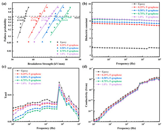 Figure 4. Dielectric properties of F−graphene/epoxy composites at different F−graphene contents (wt.%). (a) Double−parameter Weibull plot of the breakdown strength. (bd) Dielectric constant, dielectric loss and AC conductivity as a function of frequency.