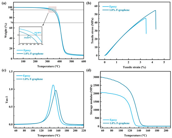 Figure 5. Thermal stability and mechanical properties of F-graphene/epoxy composite. (a) TGA curves. (b) Stress–strain curves. (c,d) DMA curves.