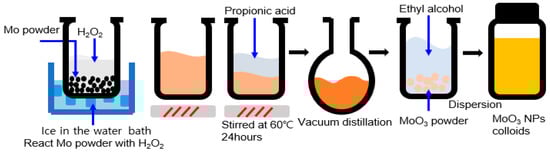 Figure 1 illustrates schematic illustrating the synthesis of MoOx NPx. To synthesize MoOx NPs, 1 g of molybdenum (Mo) powder (Sigma Aldrich, St. Louis, MO, USA) with a size of <150 nm and purity of 99.99% was added to a beaker that was placed in the ice bath, followed by slowly pouring 10 mL of hydrogen peroxide (H2O2) (Sigma Aldrich) solution into the beaker and stirring for 1 h. When the color of the solution changed from grey to orange, 10 mL of propionic acid (Sigma Aldrich) with a purity of 99.5% was added to the solution and stirred at 60 °C for 24 h to ensure that it was fully dissolved. MoOx powder was obtained after vacuum distillation of the dissolved solution at 50 °C for 30 m. The powder was dispersed in ethanol (EtOH) (Daejung Chemical and Metals, Gyeonggi, Republic of Korea) at a pre-determined ratio.